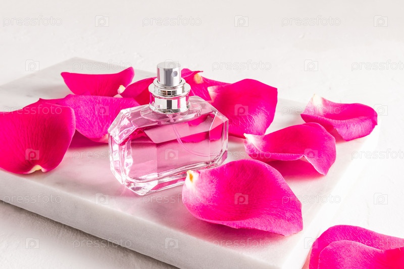 Шикарный граненый флакон женских духов стоит на мраморном белом каменном подиуме с крупными розовыми лепестками чайной розы. Презентация аромата