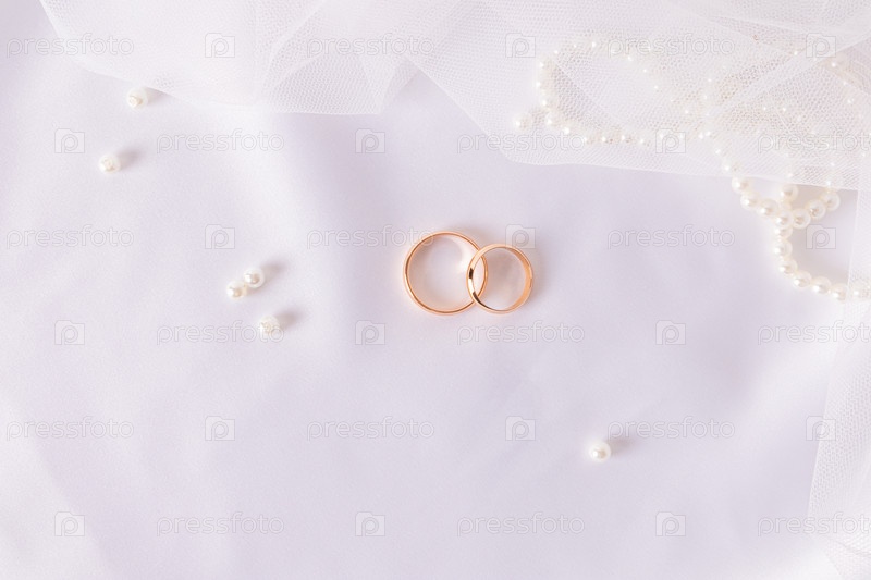 Два золотых обручальных кольца на шикарном белом атласном фоне с жемчужным ожерельем и вуалью. свадебный фон. макет для дизайна