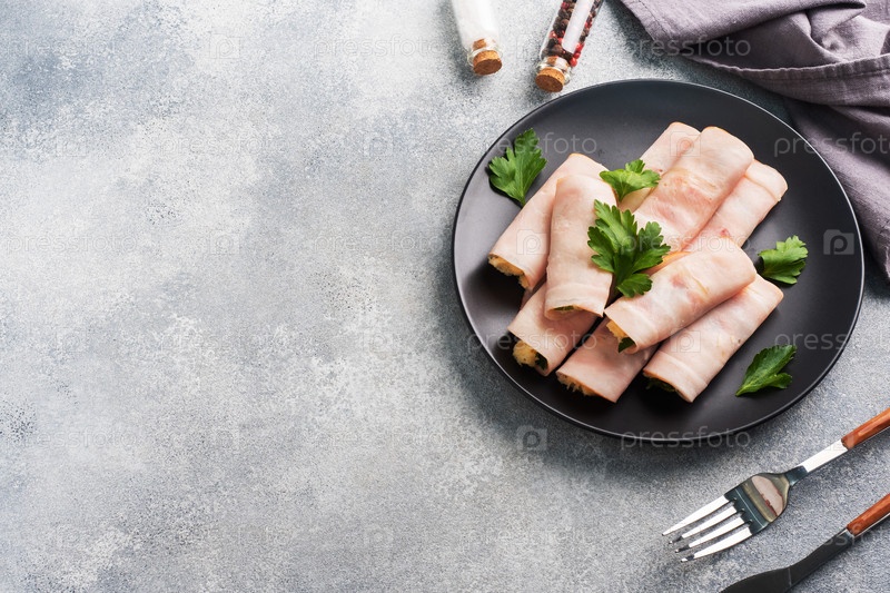 Рулетики с ветчиной и сыром на тарелке. Вкусная закуска из мясного карбоната и сливочного сыра