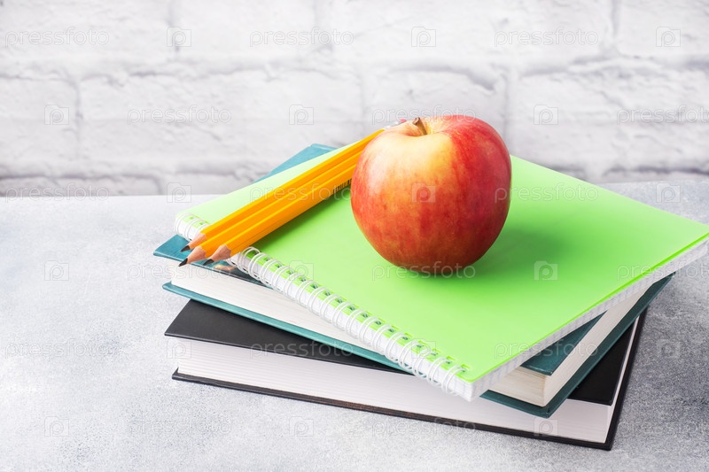 Свежее красное яблоко на стопке книг и тетрадей. Концепция школьного завтрака. Копировать пространство,