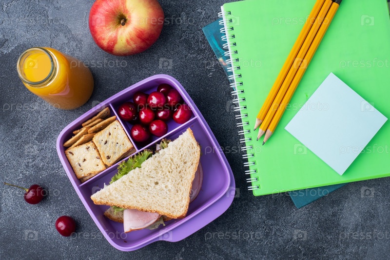 Вкусный здоровый сэндвич в коробке для завтрака, печенье и вишня. Возьмите обед с собой в школу или офис, Сок в бутылке и яблоко
