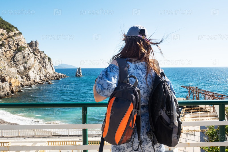 Молодая туристка с двумя рюкзаками на спине смотрит на море