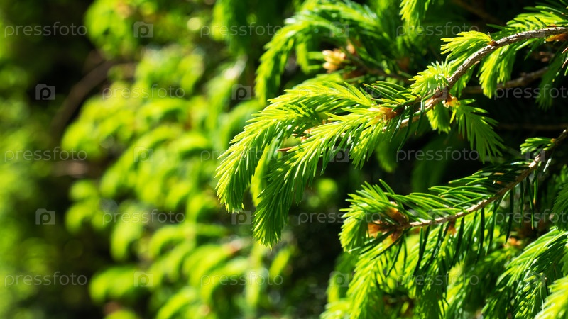 Цветущие молодые хвойные деревья весной в лесу