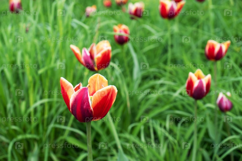 Красивые яркие цветы тюльпаны растут в парке, крупным планом. Естественный фон