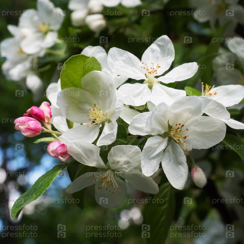 Красивая ветка с цветами яблонь с солнцем