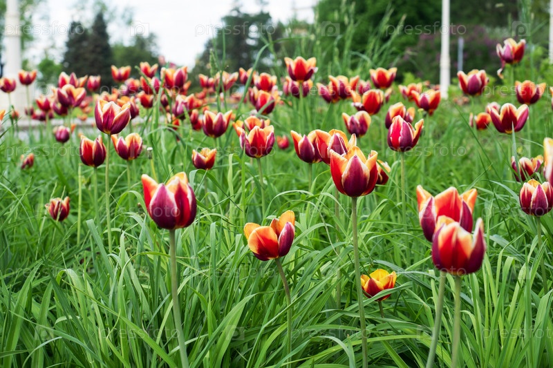 Красивые яркие цветы тюльпаны растут в парке, крупным планом. Естественный фон
