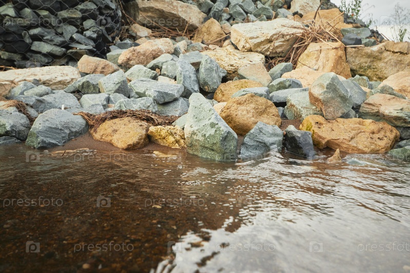 Скалы на речном пляже с размытием волны, выборочный фокус