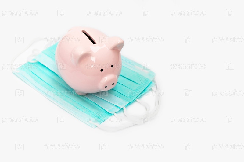 Розовая свинья-копилка на нестерильной зеленой маске