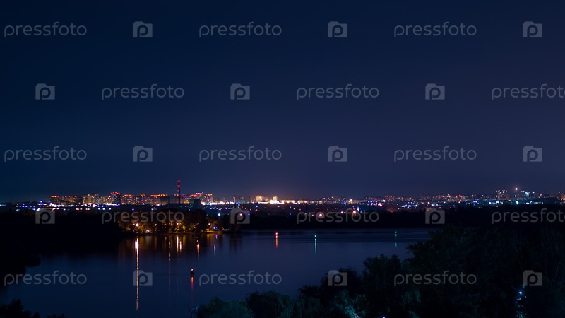 Парк с озером или рекой. Здания и ночные огни города на заднем плане