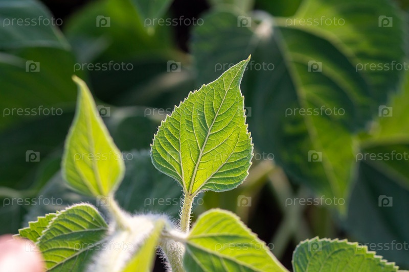 Несколько листьев подсолнуха, красиво освещенных солнцем. Видны жилки на листьях и ворсинки на стебле