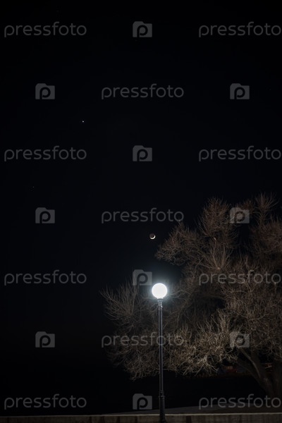 Ночной вид на дерево и уличный фонарь с луной на заднем плане