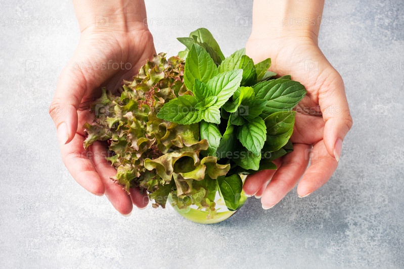 Свежие листья базилика, мята и салат. Букет ароматных трав и специй и женские руки