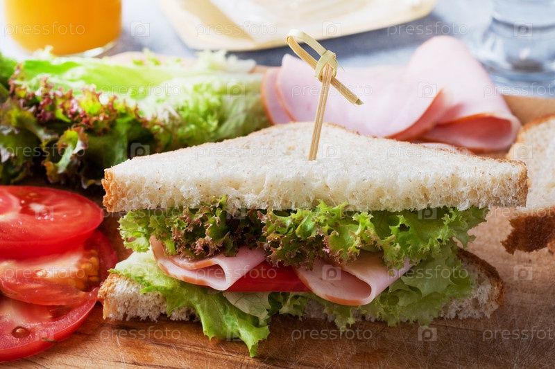 Вкусный здоровый бутерброд для завтрака закуски. Салат из листьев тостового хлеба с помидорами и ветчиной