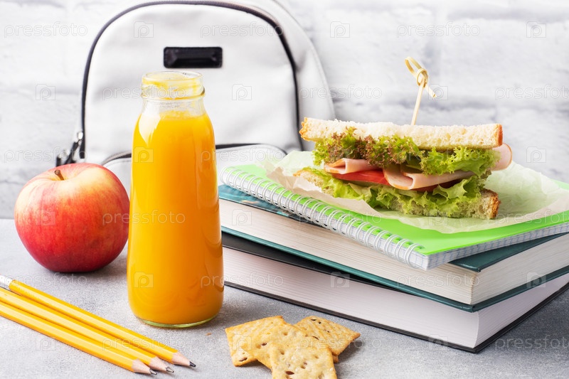 Закуска для школы с бутербродом, свежим яблоком и апельсиновым соком. Красочные школьные принадлежности