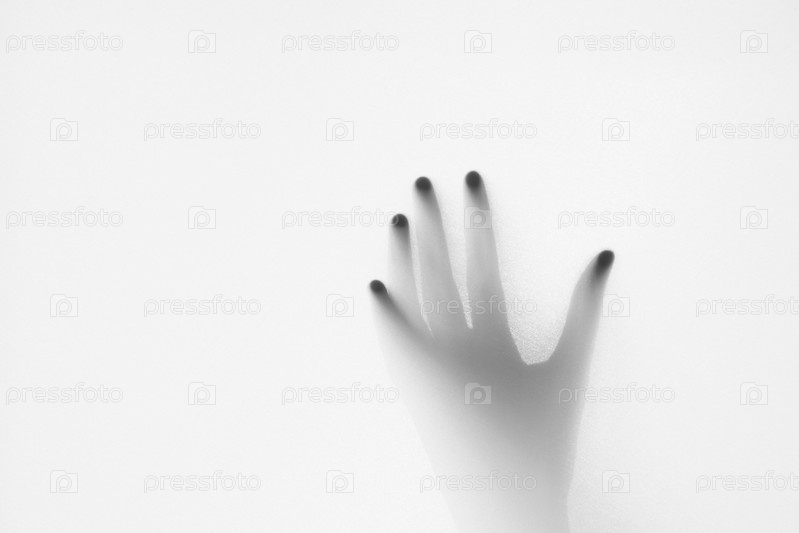 Расфокусированный силуэт руки за матовым стеклом в черно-белом режиме, концепция хэллоуина