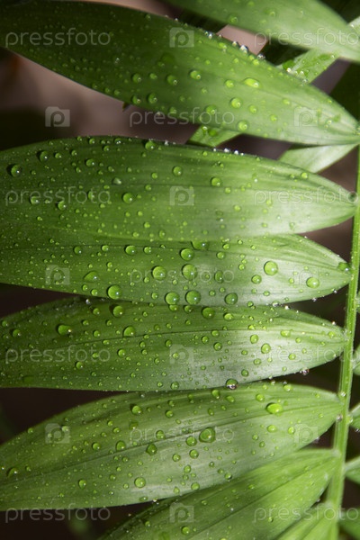 Капли воды на зеленом листе, вид крупным планом