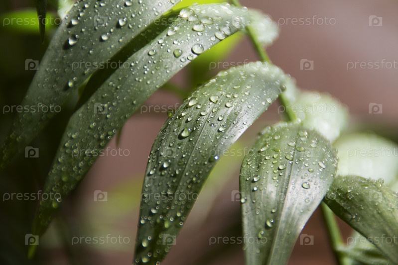 Капли воды на зеленом листе, вид крупным планом