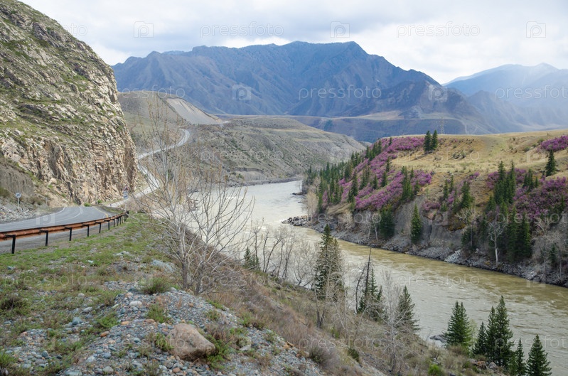 Чуйский тракт в мае, цветущий маральник на берегу Катуни