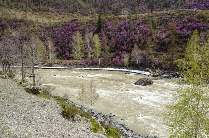 Цветение маральника на берегу реки Катунь, Горный Алтай