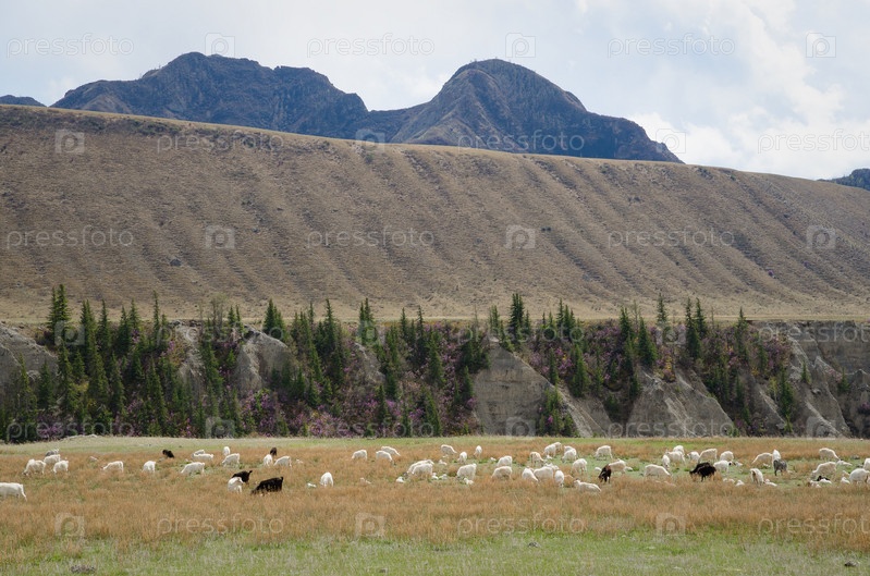 Стадо коз на лугу на фоне гор и цветущий маральник
