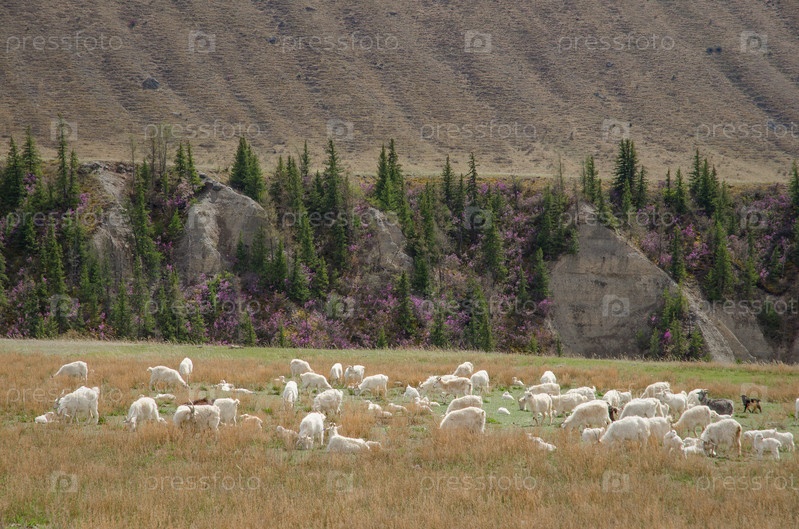 Стадо коз на лугу на фоне цветущего маральника