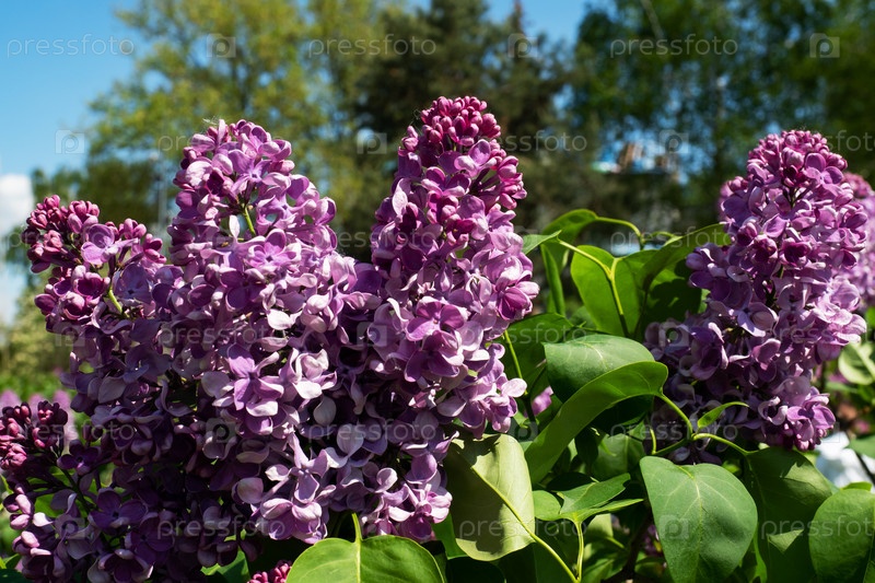 Красивые ароматные сиреньи цветки Siringa vulgaris цветут на деревьях в городском парке