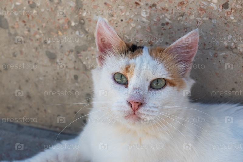 Уличный кот лежит, прислонившись к стене