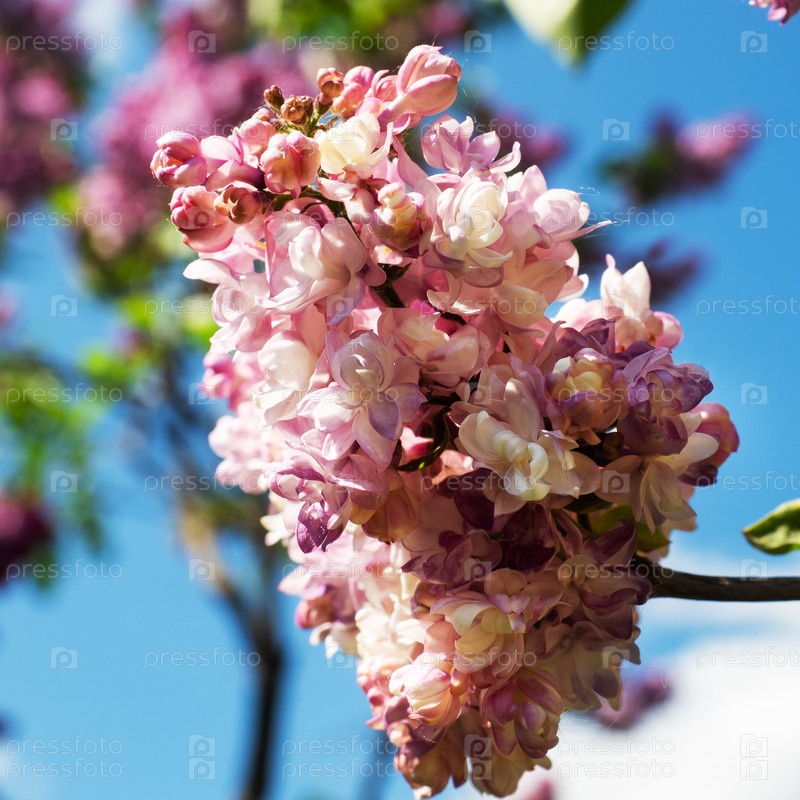 Красивые ароматные сиреньи цветки Siringa vulgaris цветут на деревьях в городском парке