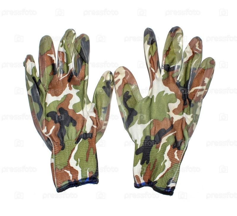 Камуфляжные прорезиненные перчатки на белом фоне.Камуфляжные прорезиненные перчатки на белом фоне.Фон камуфляжных перчаток