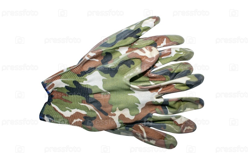 Камуфляжные прорезиненные перчатки на белом фоне.Камуфляжные прорезиненные перчатки на белом фоне.Фон камуфляжных перчаток