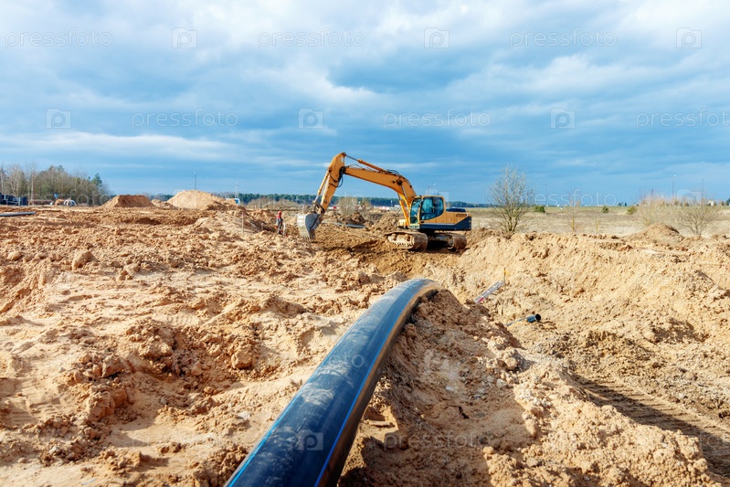 Гусеничный экскаватор работает на строительной площадке во время прокладки или замены труб подземной ливневой канализации. Монтаж систем водопровода, канализации, ливневой канализации во время - Изображение