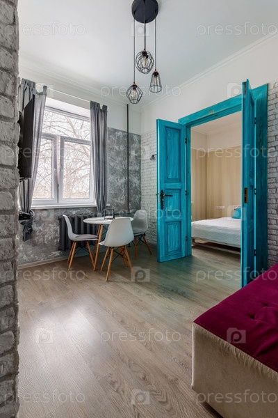 Интерьер квартиры в старинном стиле, с высокими потолками и старой деревянной дверью бирюзового цвета