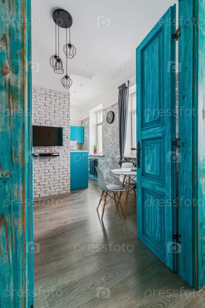 Интерьер квартиры в старинном стиле, с высокими потолками и старой деревянной дверью бирюзового цвета