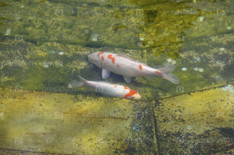 Разноцветные бело-оранжевые японские карпы плавают в пожелтевшем искусственном пруду в городском парке. Оранжевая японская рыба кои плавает в искусственном пруду с монетами