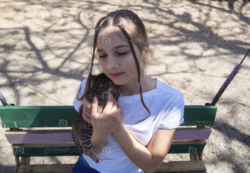 Девочка-подросток с дружелюбным лицом с закрытыми глазами нежно обнимает полосатого котенка