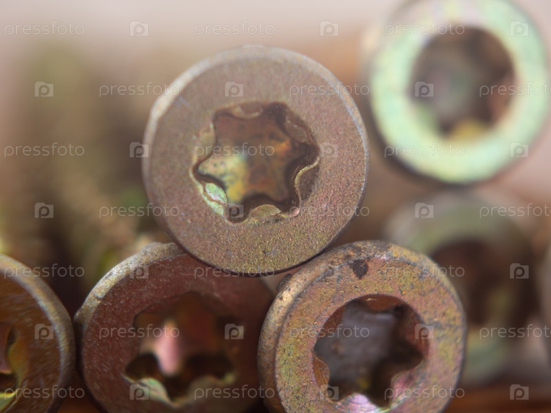 Макрофото винтов с головкой Torx, мягкий фокус можно использовать для фона. Винтовки по дереву, фанере или ДСП. Головы винтов Torx в крупном плане