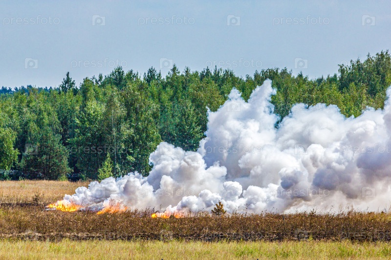 Сильный пожар в поле, горящая трава сильно дымит