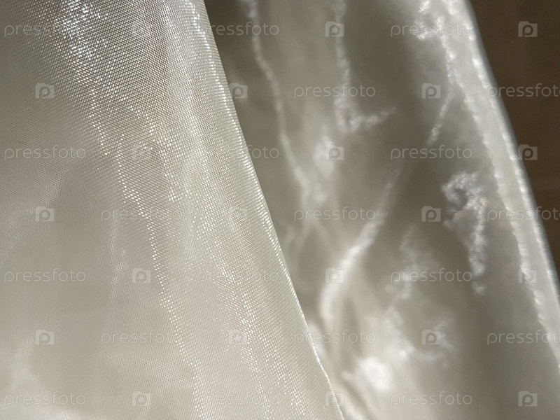 Органза белого и бежевого или цвета шампанского крупным планом. Легкие прозрачные тюлевые шторы при боковом освещении