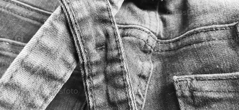 Модная джинсовая одежда. Детали и швы на грубой джинсовой ткани. Черно-белая фотография