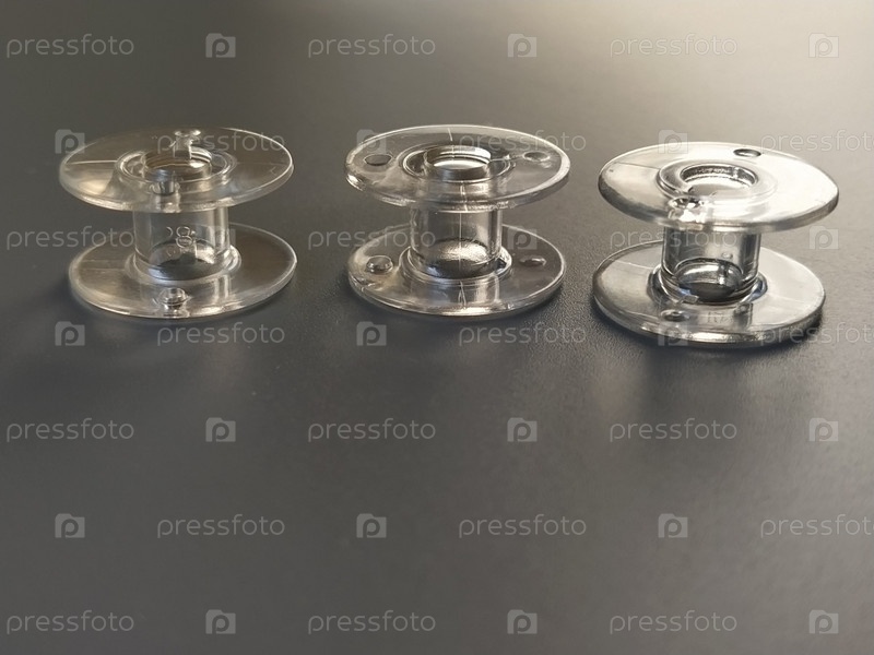 Три прозрачные пластиковые шпульки для швейных машин. Текстильная промышленность. Деталь швейного оборудования. Серый фон, подсветка