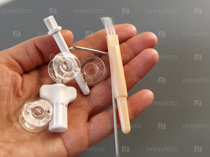 Прозрачные пластиковые шпульки от современной швейной машины в ладони женщины - швеи, иглы, нитепритягиватель, инструмент для взбивания. Серый фон. швейные машинки