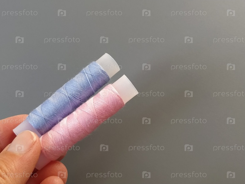 Катушки с розовыми и голубыми нитками на женской руке. Текстильная промышленность. Серый фон