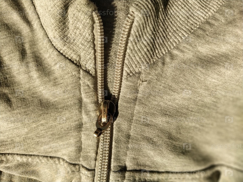 Металлический замок на серой ткани с длинным рукавом. Портняжное дело
