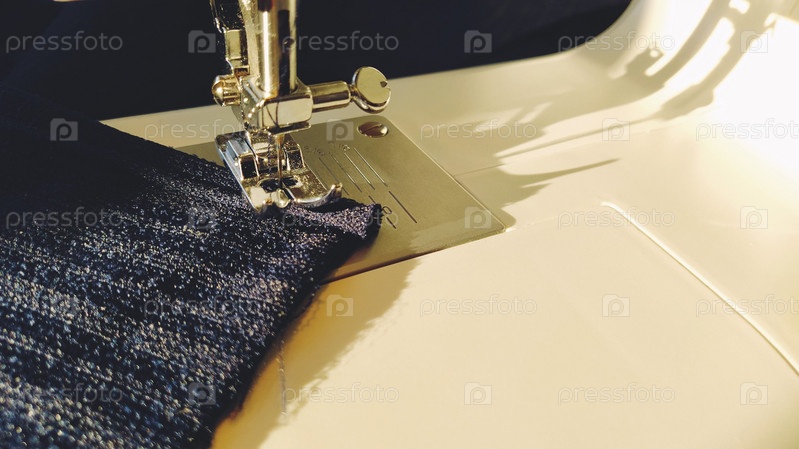 Процесс шитья на современной швейной машине, крупный план. Лапка для швейной машины с иглой. Ткань темно-синего цвета отделана двойным завертыванием края ткани. Естественный солнечный свет. Копировать пространство