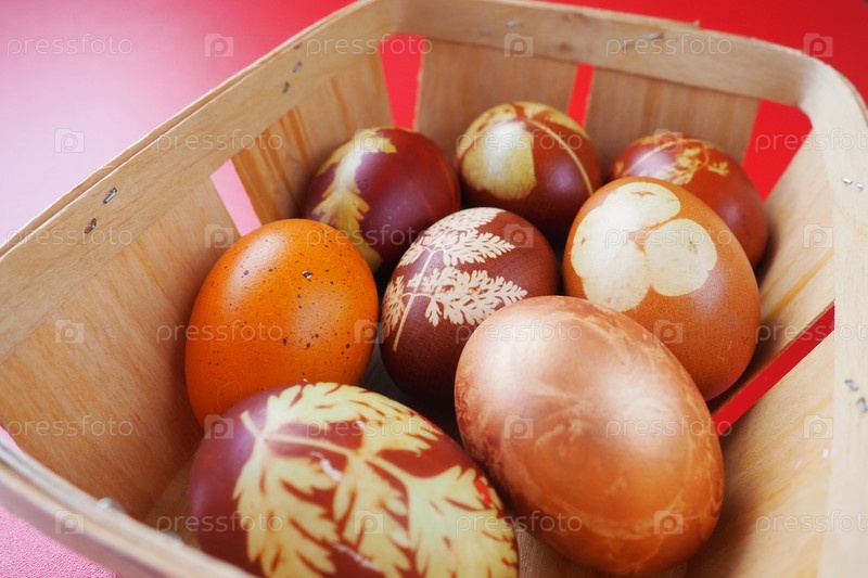 Пасхальная корзина крупным планом с красочными яйцами. Вареные куриные яйца с красной и коричневой скорлупой, окрашенные луковой шелухой по традиционному рецепту. Цветочный узор из листьев растений