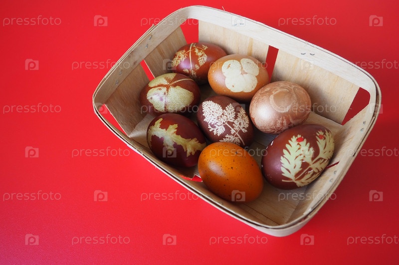 Пасхальная корзина крупным планом с красочными яйцами. Вареные куриные яйца с красной и коричневой скорлупой, окрашенные луковой шелухой по традиционному рецепту. Цветочный узор из листьев растений