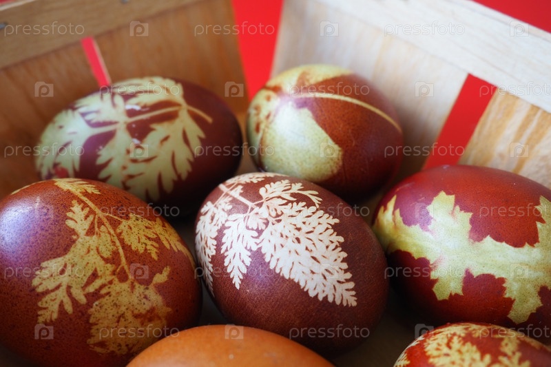 Пасхальная корзина крупным планом с красочными яйцами. Вареные куриные яйца с красной и коричневой скорлупой, окрашенные луковой шелухой по традиционному рецепту. Цветочный узор из листьев растений