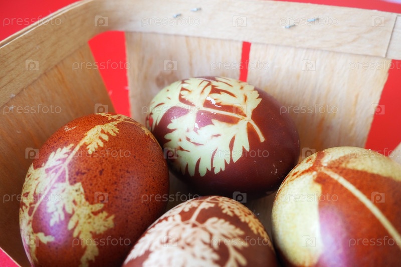 Пасхальная корзина крупным планом с красочными яйцами. Вареные куриные яйца с красной и коричневой скорлупой, окрашенные луковой шелухой по традиционному рецепту. Цветочный узор из листьев растений