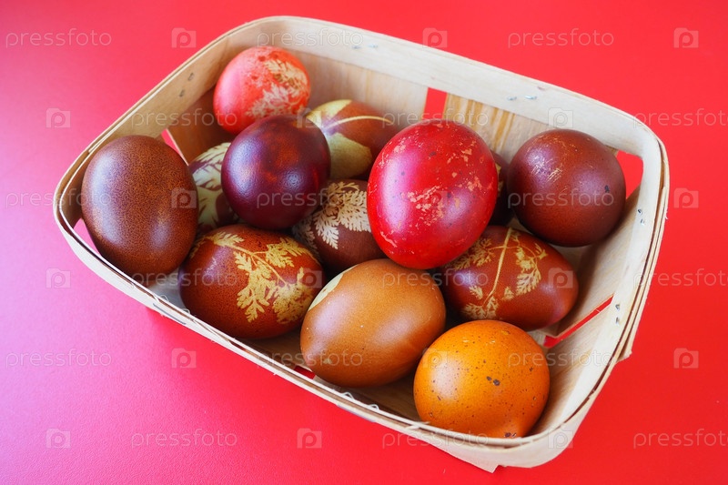 Пасхальная корзина крупным планом с красочными яйцами. Вареные куриные яйца с красной и коричневой скорлупой, окрашенные луковой шелухой по традиционному рецепту. Цветочный узор из листьев растений