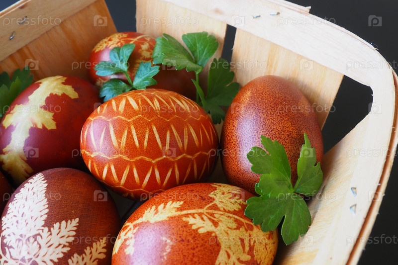 Пасхальная корзина крупным планом с красочными яйцами. Вареные куриные яйца с красной и коричневой скорлупой, окрашенные луковой шелухой по традиционному рецепту. Цветочный узор из листьев растений. Свежая петрушка